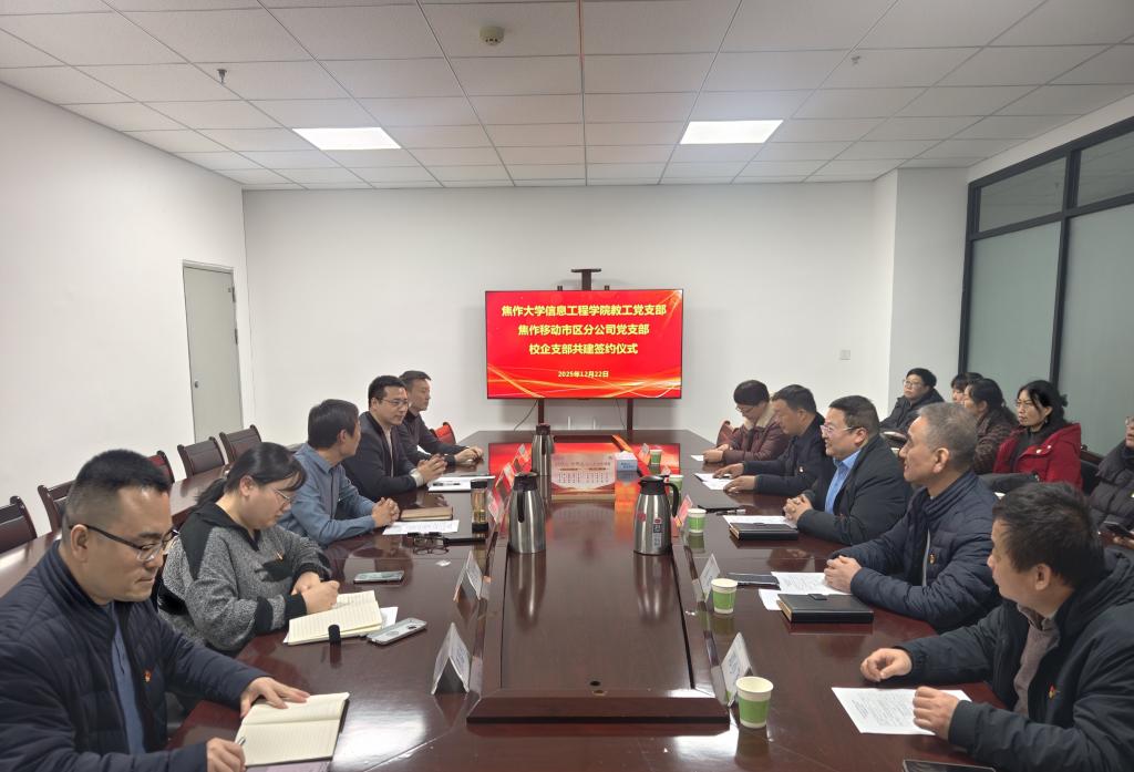 为深入学习贯彻习近平新时代中国特色社会主义思想,推动党建与业务深度融合,探索校企合作新路径,12月22日下午,焦作大学信息学院教工支部与焦作移动市区分公司支部联合主题党日活动在焦作移动市区分公司举行。信息工程学院班子成员周冰、张宏、赵杰文、邓小飞,焦作移动市区分公司班子成员乔胜利、关欢欢、马国强、原超利、刘猛,以及信息学院教工支部13名党员参加了此次活动。